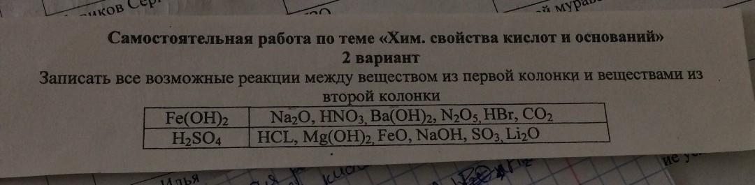 Записать все возможные реакции между веществом из первой колонки и веществами из второй колонки