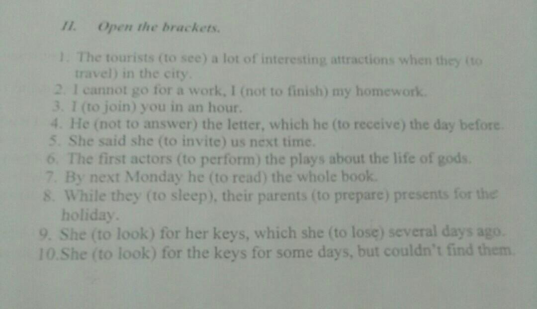 1 saw … were traveling 2 haven’t finished 3 shall join 4 didn’t answer … had received 5 would invite 6 performed 7 will have read 8 were sleeping … prepared 9 is looking … lost 10 looked