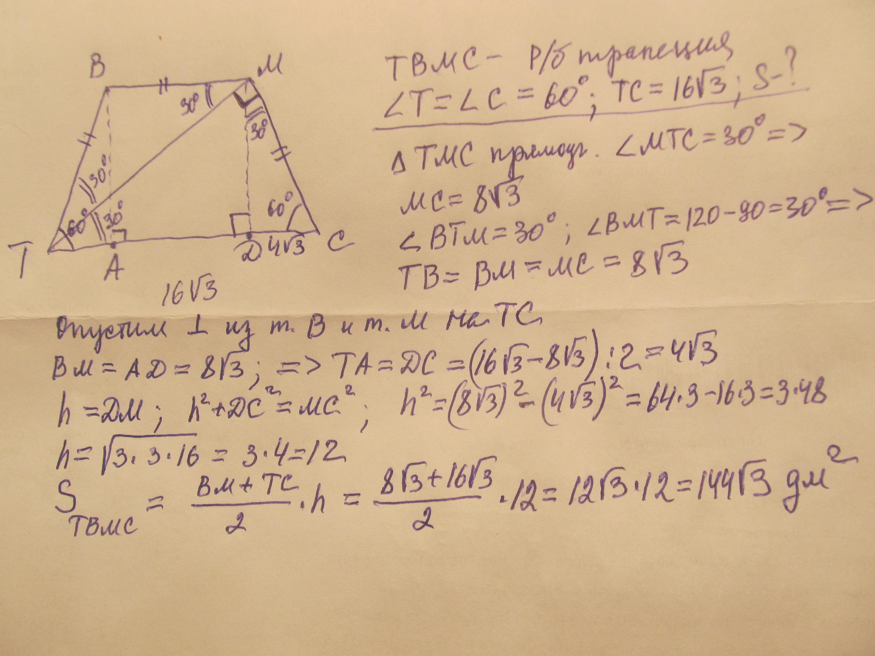 В равнобедренной трапеции TBMC один из углов равен 60° , угол ТМС - прямой, сторона ТС = 16√3 дм. Найдите площадь данной трапеции .