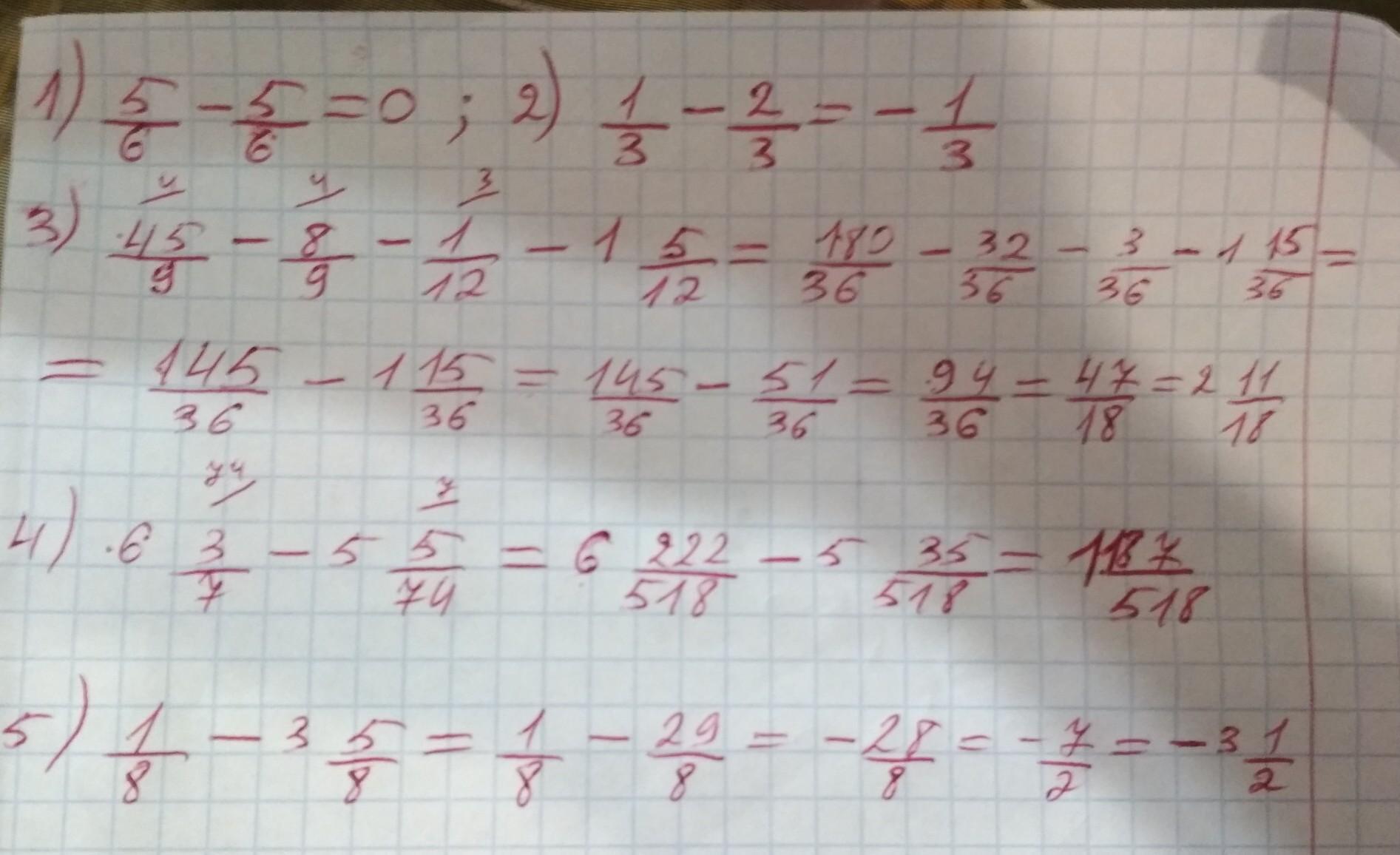 выполните вычитание 5/6 - 5/6 1/3 - 2/3 45 / 9 - 8 / 9 - 1/12 - 1 5/12 6 3/7 - 5 5/74 1/8 - 3 5/8