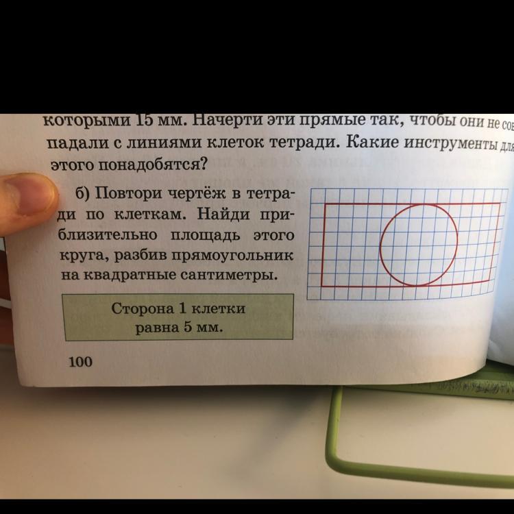 Повтори чертёж в тетради по клеткам, Найди приблизительно площадь с этого круга, разбив прямоугольник на квадратные сантиметры.