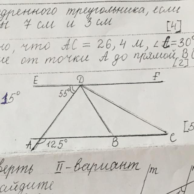На рисунке угол СDF меньше угла АDF на 76 градусов и меньше треугольника АDB на 15 градусов найдите углы треугольника ВDC
