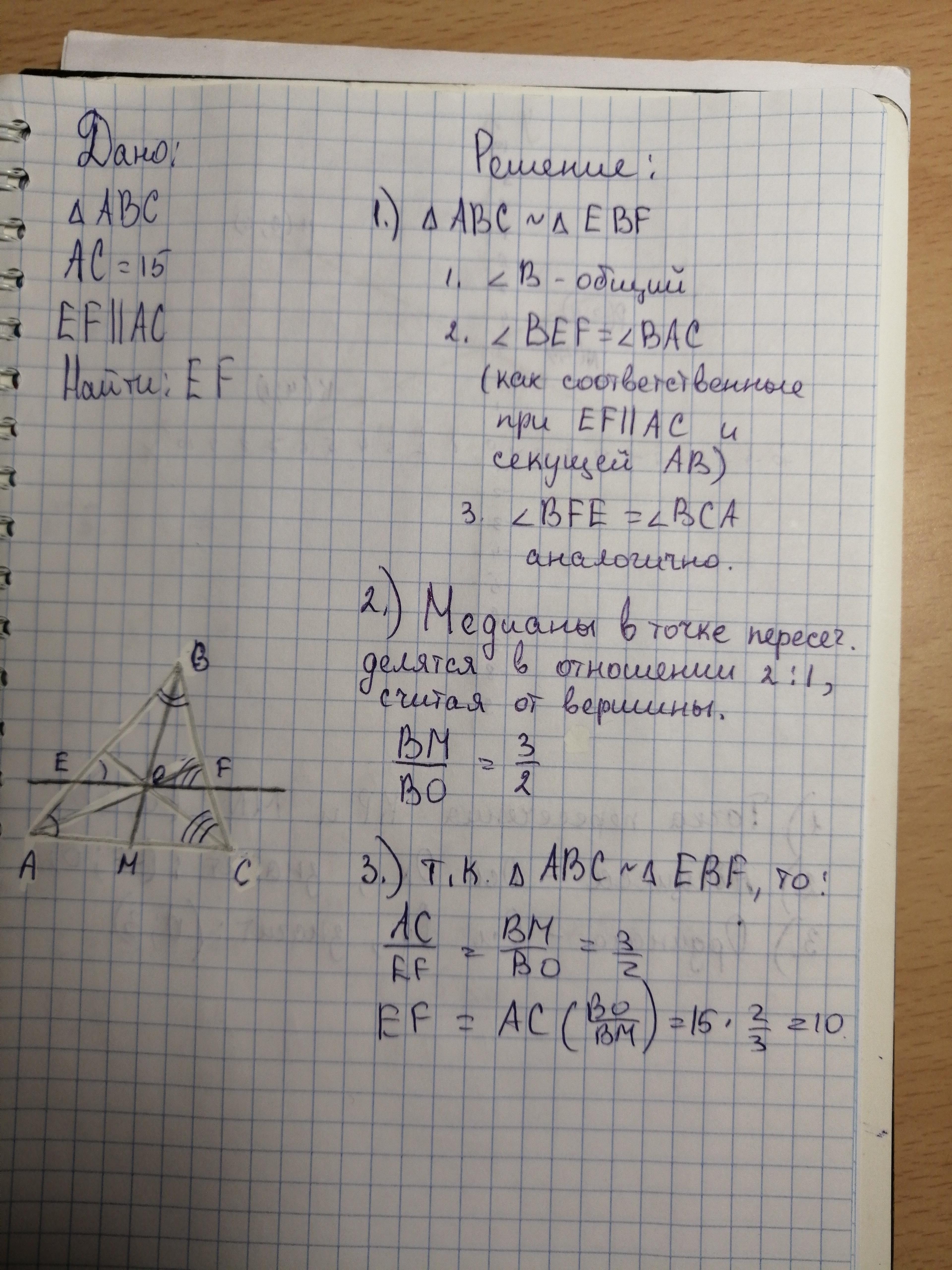 Медианы треугольника ABC пересекаются в точке O. Через точку O проведена прямая,параллельная стороне AC и пересекающая стороны AB и BC в точках E и F соответственно. Найти Ef, если сторона AC равна 15 см.