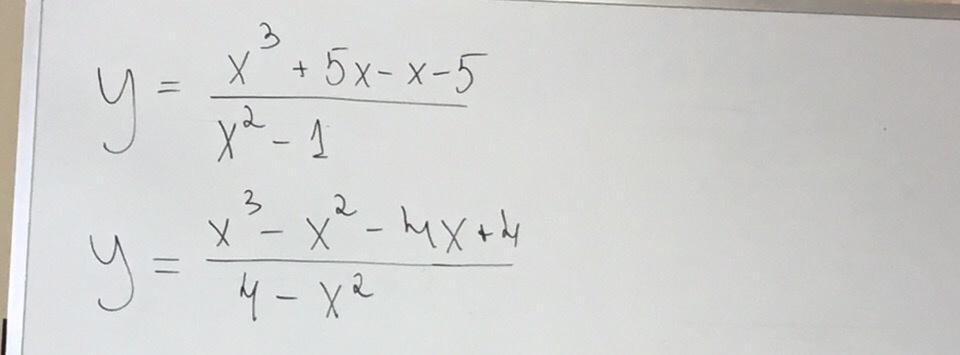 2) y=x^3-x^2-4x+4/ 4-x^2=x^2(x-1)-4(x-1)/(4-x^2)=(x-1)(x^2-4)/ (4-x^2)=-x+1, обл. опр. 4-x^2 не=0, x^2 не=4, х не=+-2, график -прямая у=-х+1, строим по точкам (0;1) и (-1;0), отмечаем на оси ОХ точки -2 и 2, проектируем на прямую и выкалываем точки на прямой.