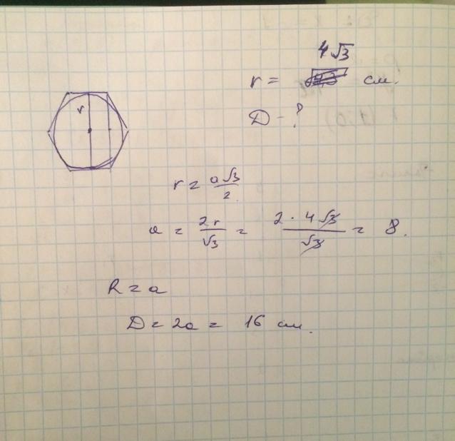 радиус окружности вписанной в правильный шестиугольник равен корень из 4, 3 см. найдите длину диаметра описанной около него окружности. Прошу помочь