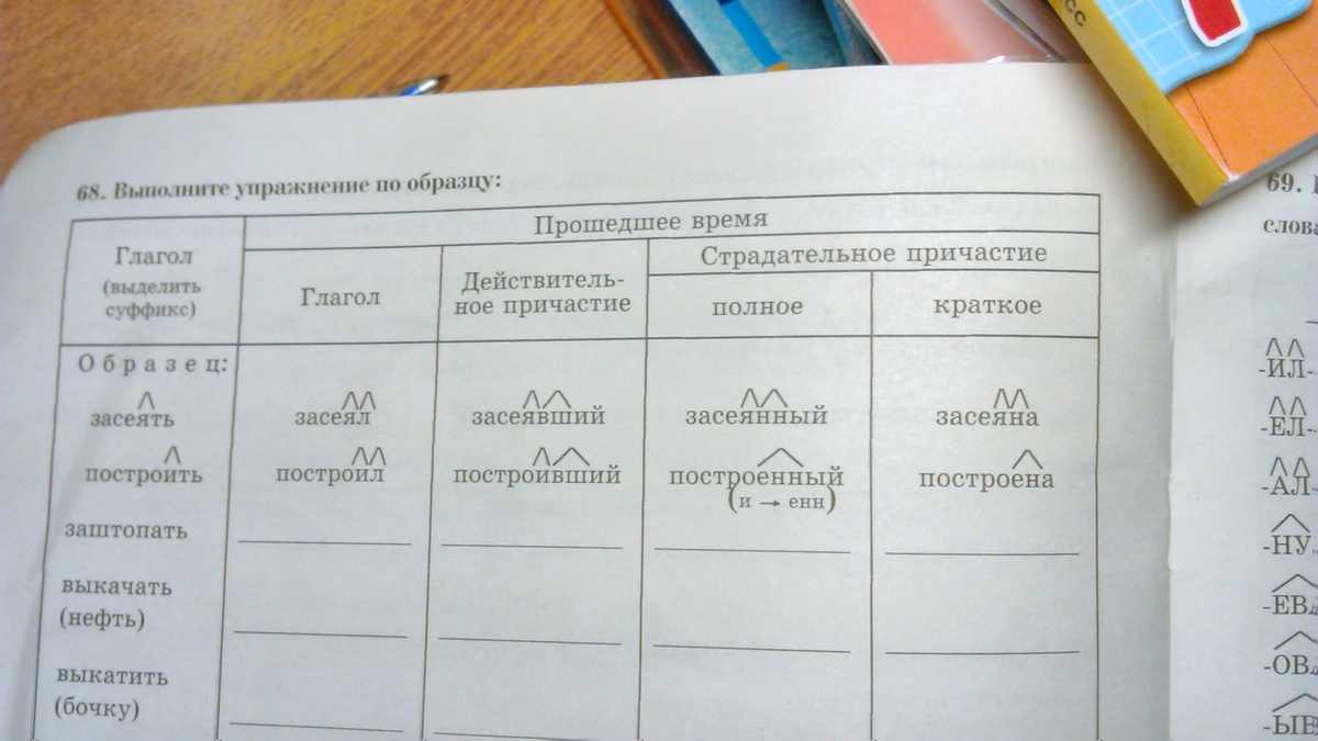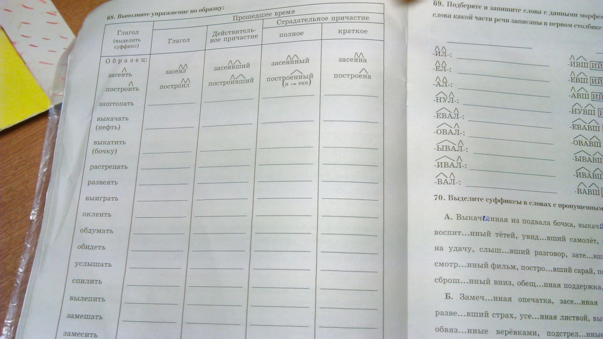 Заштопать- заштопавший - заштопанный заштопана, Выкачать выкачал- выкачавший- выкачана,Выкатить - выкатил- выкативший а страдательное причастие не образуется ни в краткой форме ни в полной, Растрепать- Растрепал- растрепавший - растрёпанный-растрепана, Развеять- развеял- развеявший - развеянный- развеяна,Выиграть- выиграл-выигравший-выигранный-выиграна, Оклеить-оклеил-оклеивший-оклеенный- оклеена,Обдумать - обдумал-обдумавший-обдуманный-обдумана,Обидеть-обидел-обидевший- обиженный-обижена,Услышать-услышал-услышавший-услышанный-услышана спилить-спилил-спиливший-спиленный-спилена,вылепить-вылепил-вылепивший- нет страдательного причастия полного и краткого,замешать- замешал-замешавший-замешанный-замешана,замесить- замесил-замесивший и нет страдательного причастия, вывод от инфинитивного суффикса и спряжения