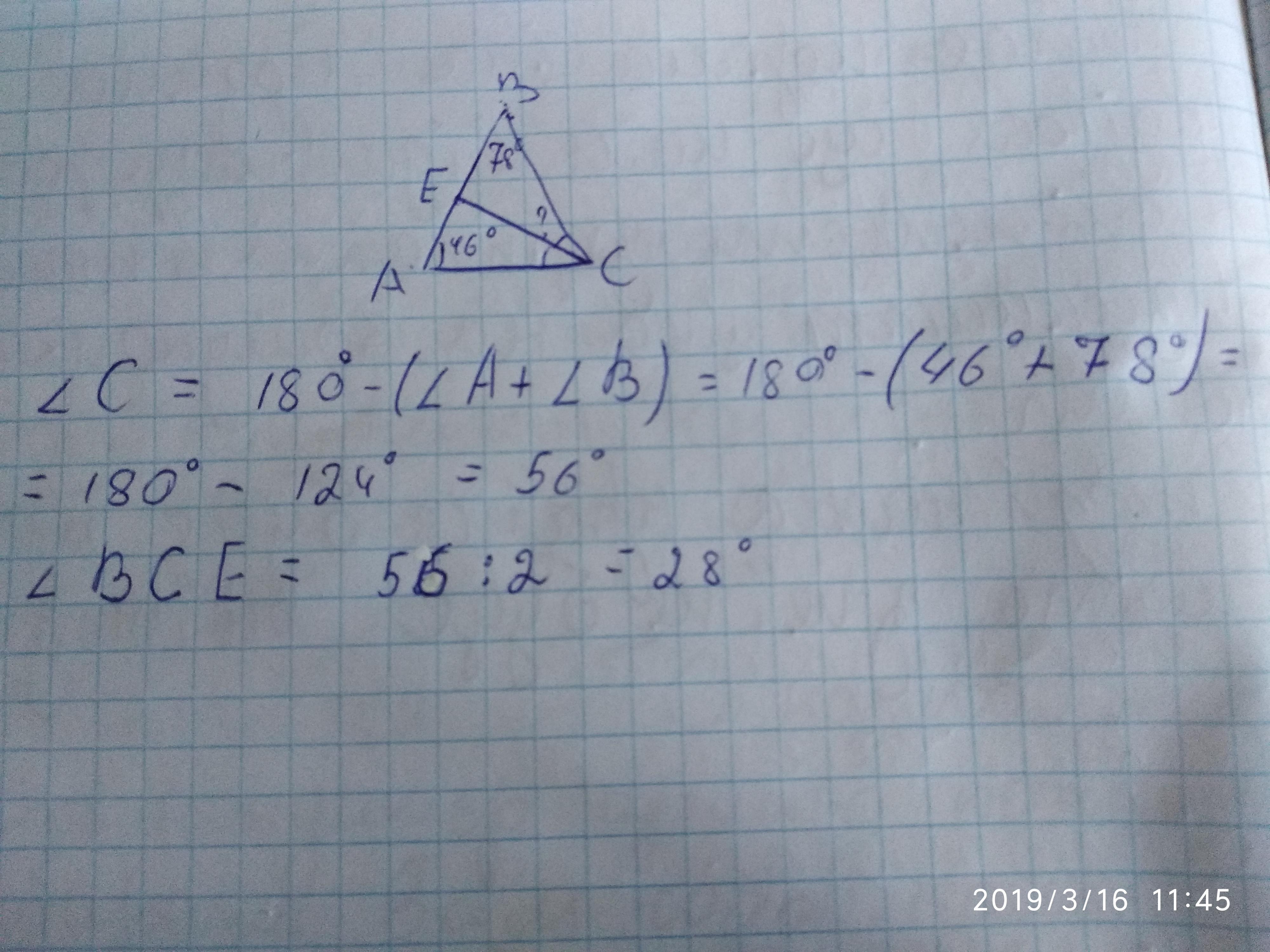 в треугольнике АВС проведена биссектриса СЕ. найдите величину угла ВСЕ если <ВАС=46º и <АВС=78º