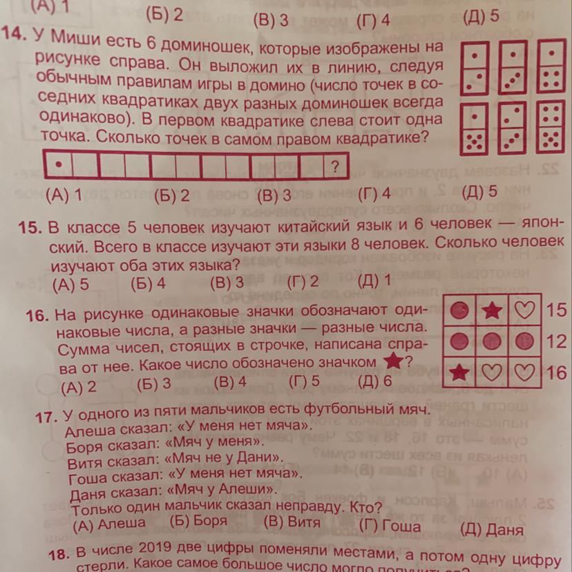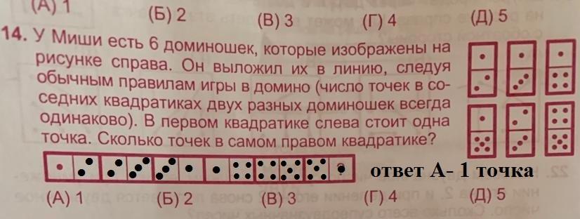 У Миши есть 6 доминошек, которые изображены на рисунке справа. Он выложил их в линию следуя обычным правилам игры в домино число точек в соседних квадратиках двух разных доминошек всегда одинаково в первом квадратики слева стоит одна. Сколько точек в самом правом квадратике?