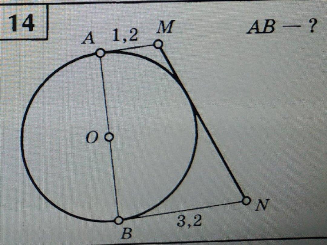 Обозначим точку касания MN к окружности С. ОС⊥MN (радиус проведенный к точке касания). ОМ биссектриса угла АОС, ОN биссектриса угла ВОС. Угол МОN=90° как угол между биссектрисами смежных углов. ОС высота проведенная из прямого угла треугольника МОN. АМ=МС (свойство отрезков к точкам касания окружности), BN=NC. ⇒ ОС=√(MC*CN)=√(1,2*3,2) ≈1,96.