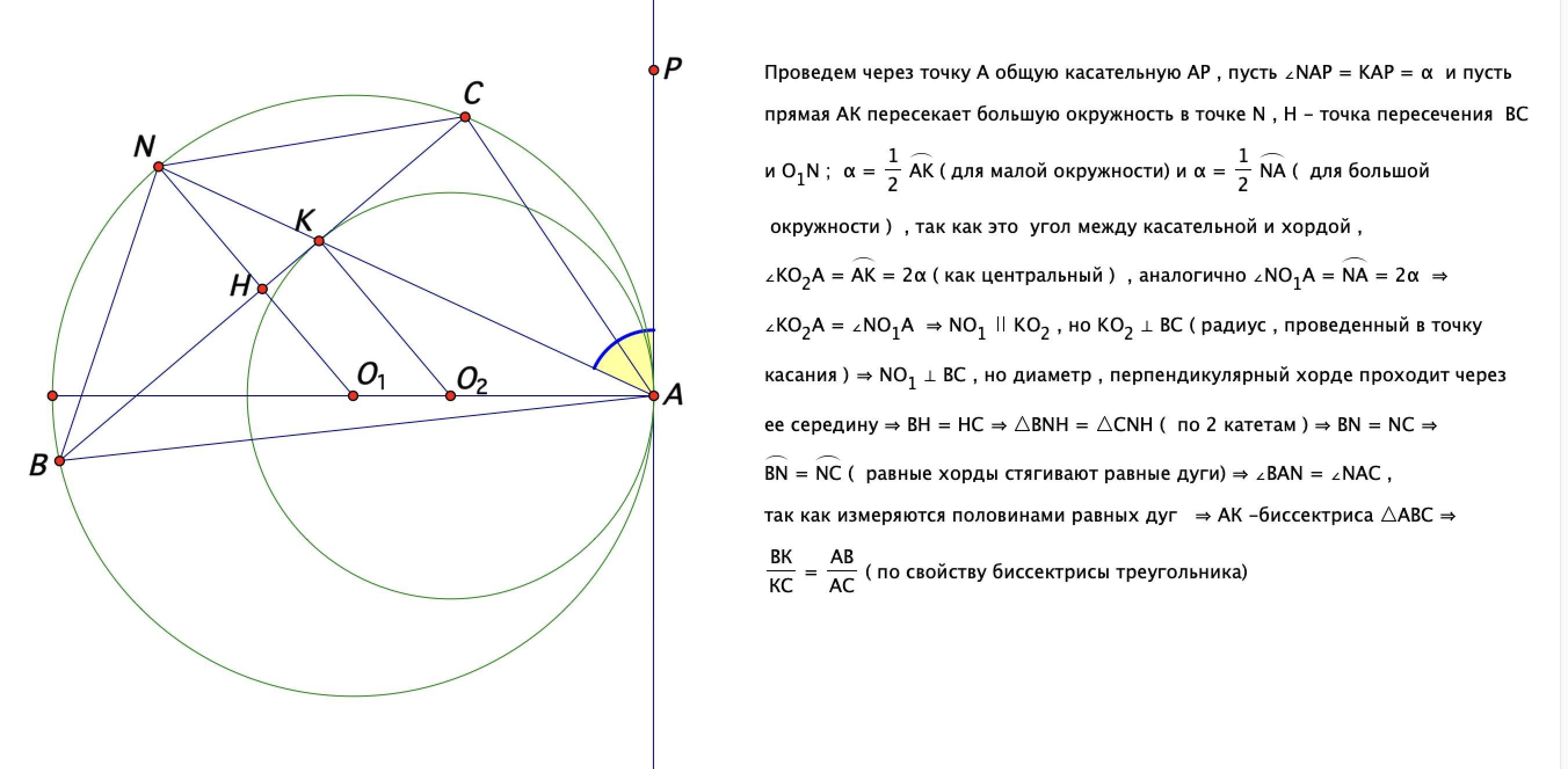 Две окружности касаются внутренним образом в точке A. Хорда BC большей окружности касается меньшей окружности в точке K. Докажите, что AB:AC=BK:KC