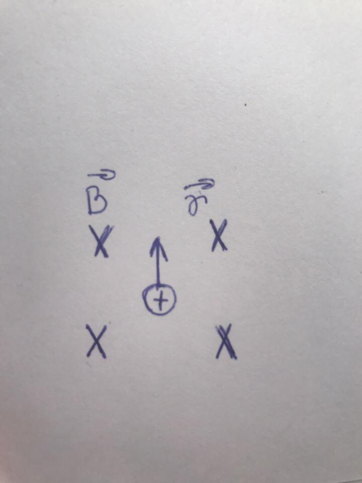 Заряженная частица движется в магнитном поле, линии индукции которого показаны на рисунке. Укажите направление силы, действующей на частицу в магнитном поле.