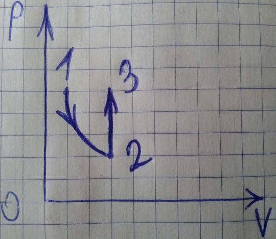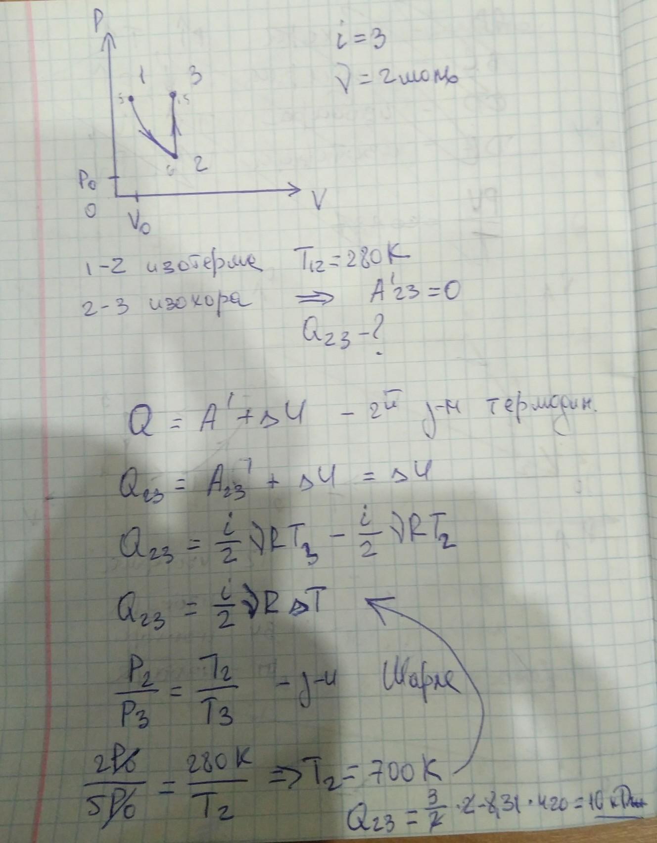Над идеальным одноатомным газом в количестве вещества 2 моль совершили процесс 1-2-3 (см.рис). Температура газа в состоянии 1 равна 280К, участок 1-2 является изотермой. Какое количество теплоты было передано газу на участке 2-3?
