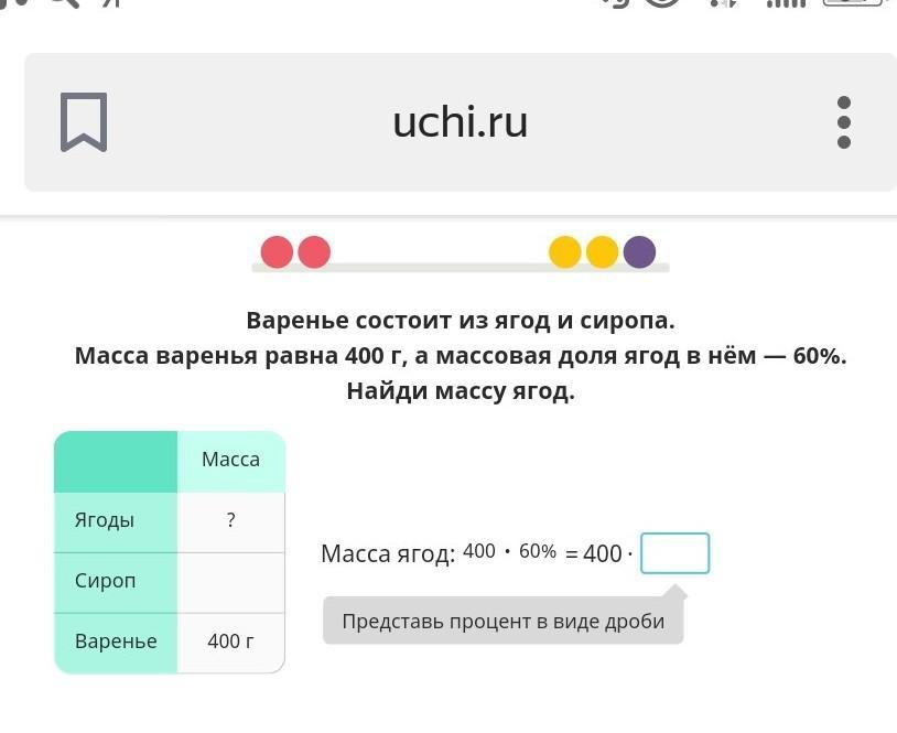 60% это 0.6 поэтому масса ягод будет 400*0,6=240г.
