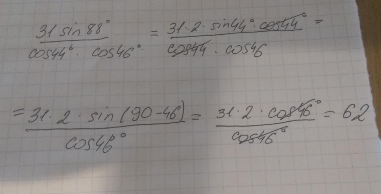 31·sin88°/(cos44°·cos46°)=31·2sin44°·cos44°/(cos44°·sin44°)=62