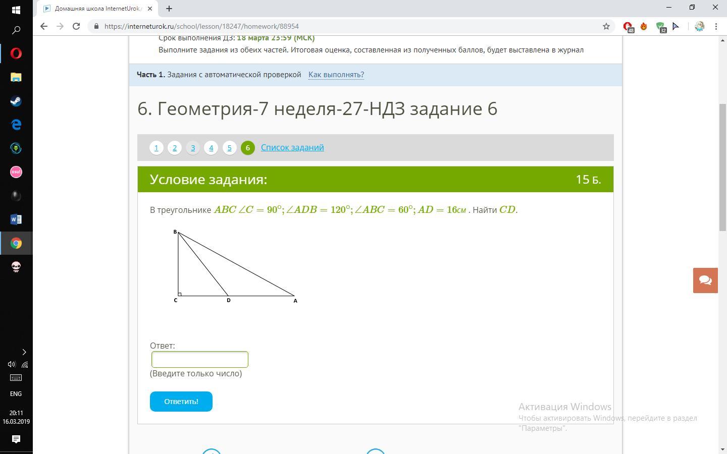 Переходи к треугольнику CBD. Катет лежащий против угла в 30 градусов, равен половине гипотенузы, т е. CD=8 см