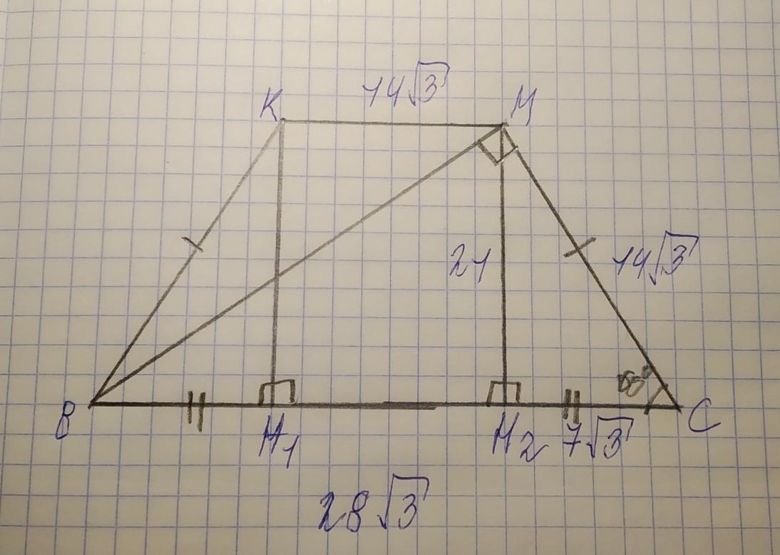 Один из углов равнобедренной трапеции BKMC равен 60 градусов,угол BMC прямой,сторона BC 28 корней из 3.Найдите площадь данной трапеции.