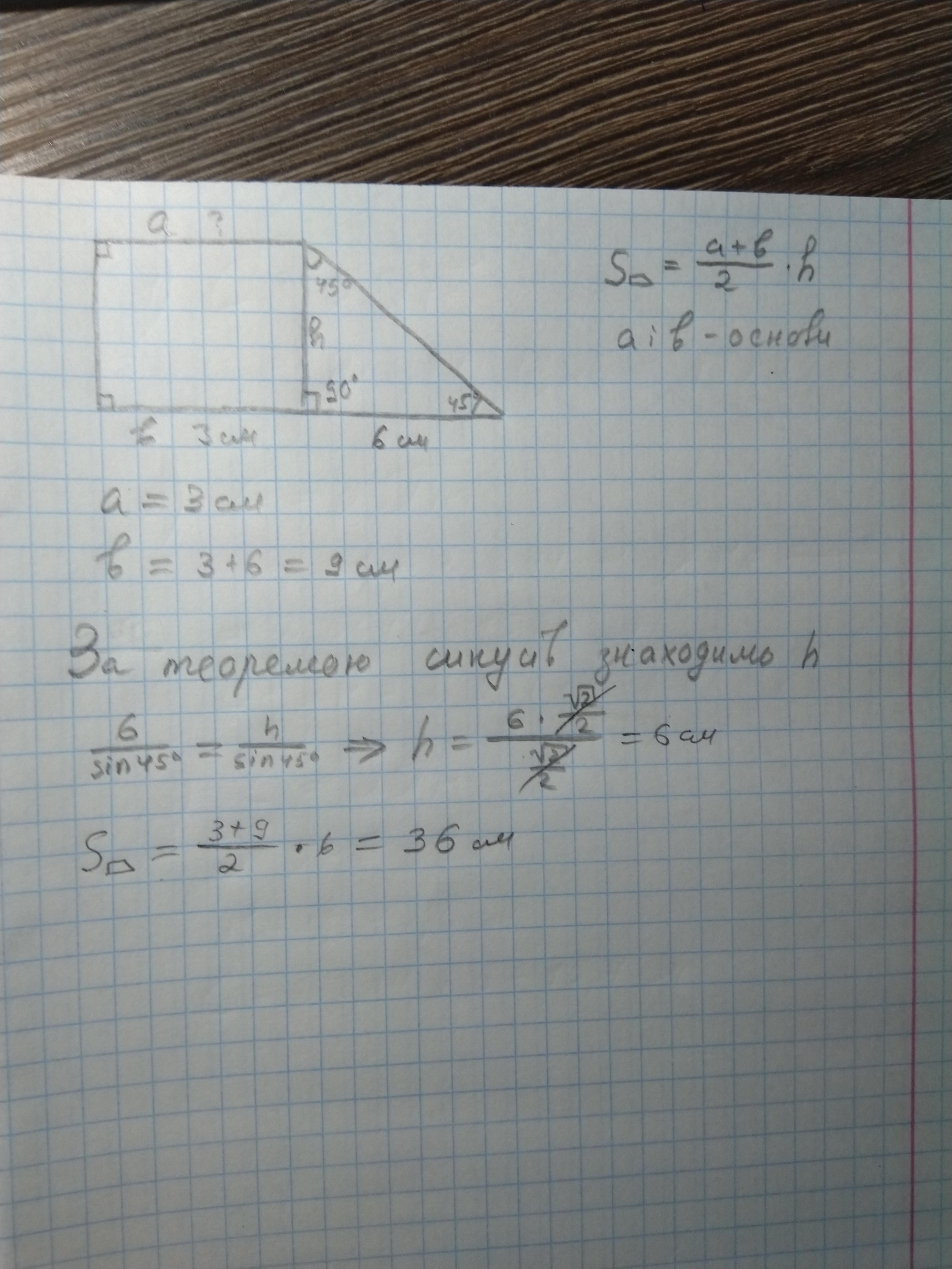 Поможіть!!У прямокутній трапеції гострий кут А дорівнює 45°,а висота,проведена з вершини тупого кута ділить більшу основи на відрізки 3 см і 6 см,починаючи від точки А.Знайдіть площу трапеції!