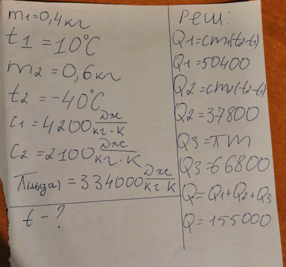 Дано уже записано у вас в решении. Для того, чтобы охладить воду до 0 градусов, потребуется "забрать" энергию Q1 = 0.4 * 10 * 4200 = 16800 Дж. Для того, чтобы нагреть лёд до 0 градусов потребуется предать ему энергию Q2 = 0,6 * 40 * 2100 = 50400 Дж. Q2 > Q1, значит вода охладится до 0 градусов. Чтобы вода замёрзла, придётся "забрать" у неё энергию Q3 = 334000 * 0,4 = 133600 Дж. Q1 + Q3 > Q2, Значит часть воды растает и образуется раствор из воды а льда температурой 0 градусов.