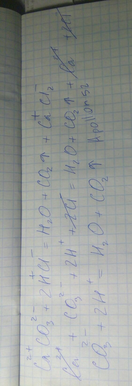 2)СаСО3+2Н(+)+2Сl(-) -> Ca(+2)+2Cl(-)+H2O+CO2
