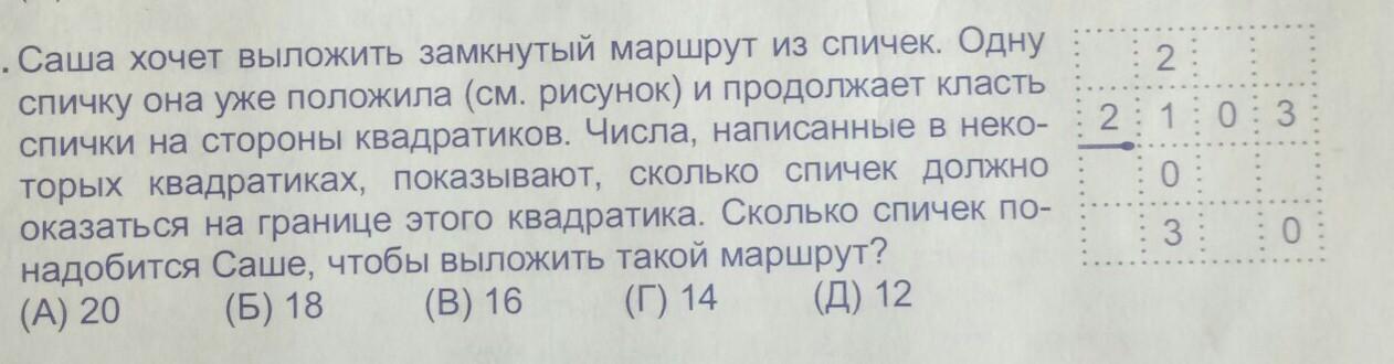 Саша хочет выложить замкнутый маршрут из спичек. Одну спичку она уже положила (см. рисунок) и продолжает класть Спички на стороны квадратиков. Числа, написанные в некоторых квадратиках, показывают, сколько спичек должно оказаться на границе этого квадратика. Сколько спичек по- надобится Саше, чтобы выложить такой маршрут?