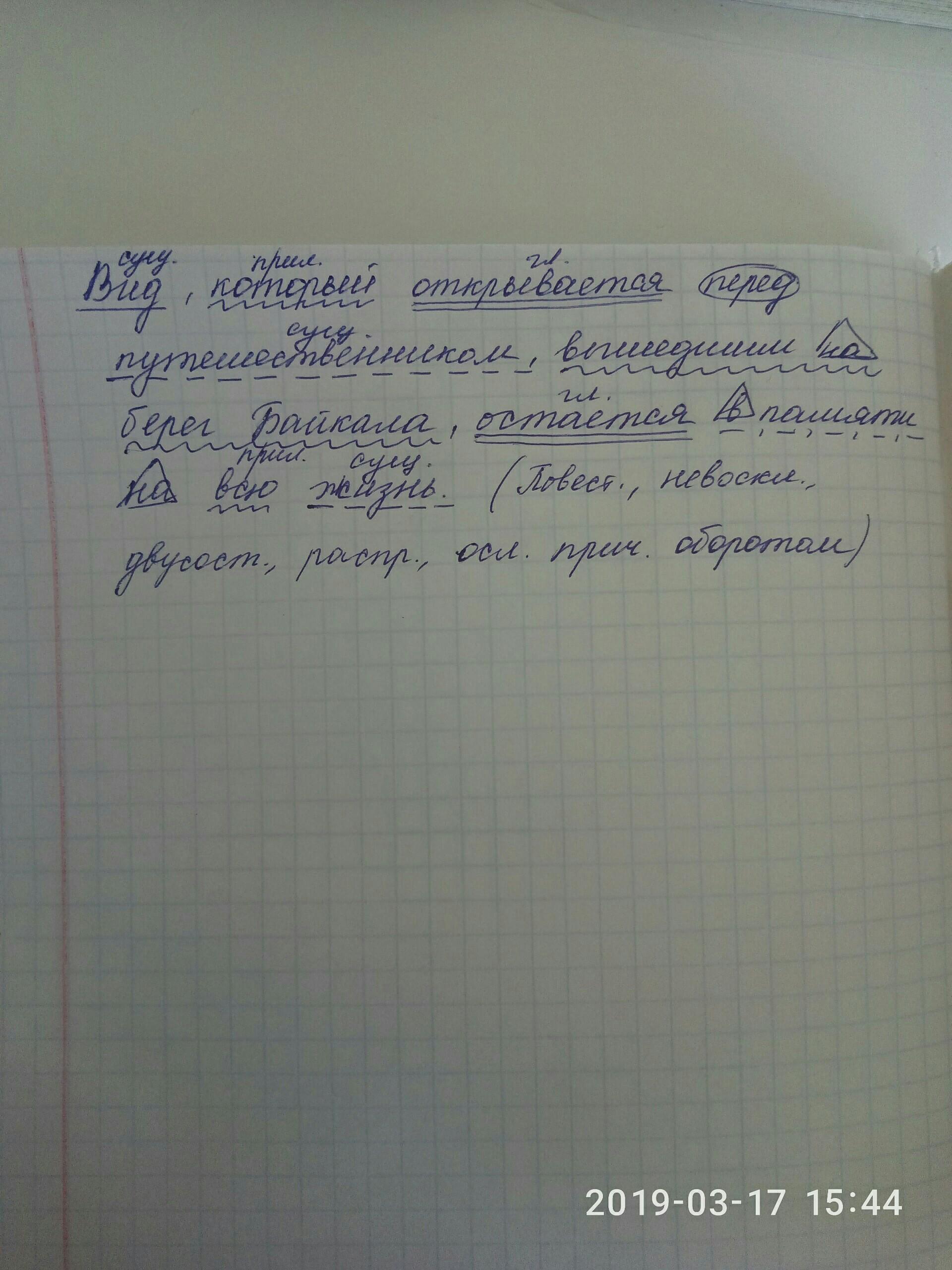 Сделать синтаксический разбор предложения (схема, части речи, хар-ка) - Вид, который открывается перед путешественником, вышедшим на берег Байкала, остаётся в памяти на всю жизнь.