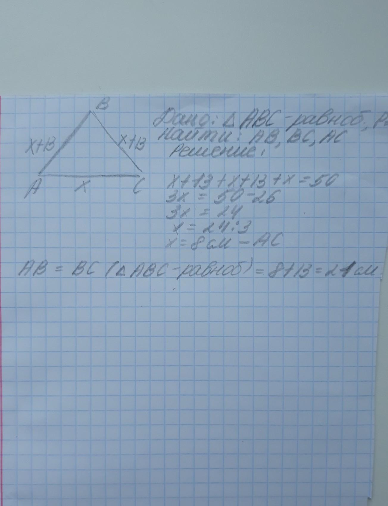 Периметр равнобедренного треугольника равен 50 см. Основание меньше боковой стороны на 13 см. Найти стороны треугольника