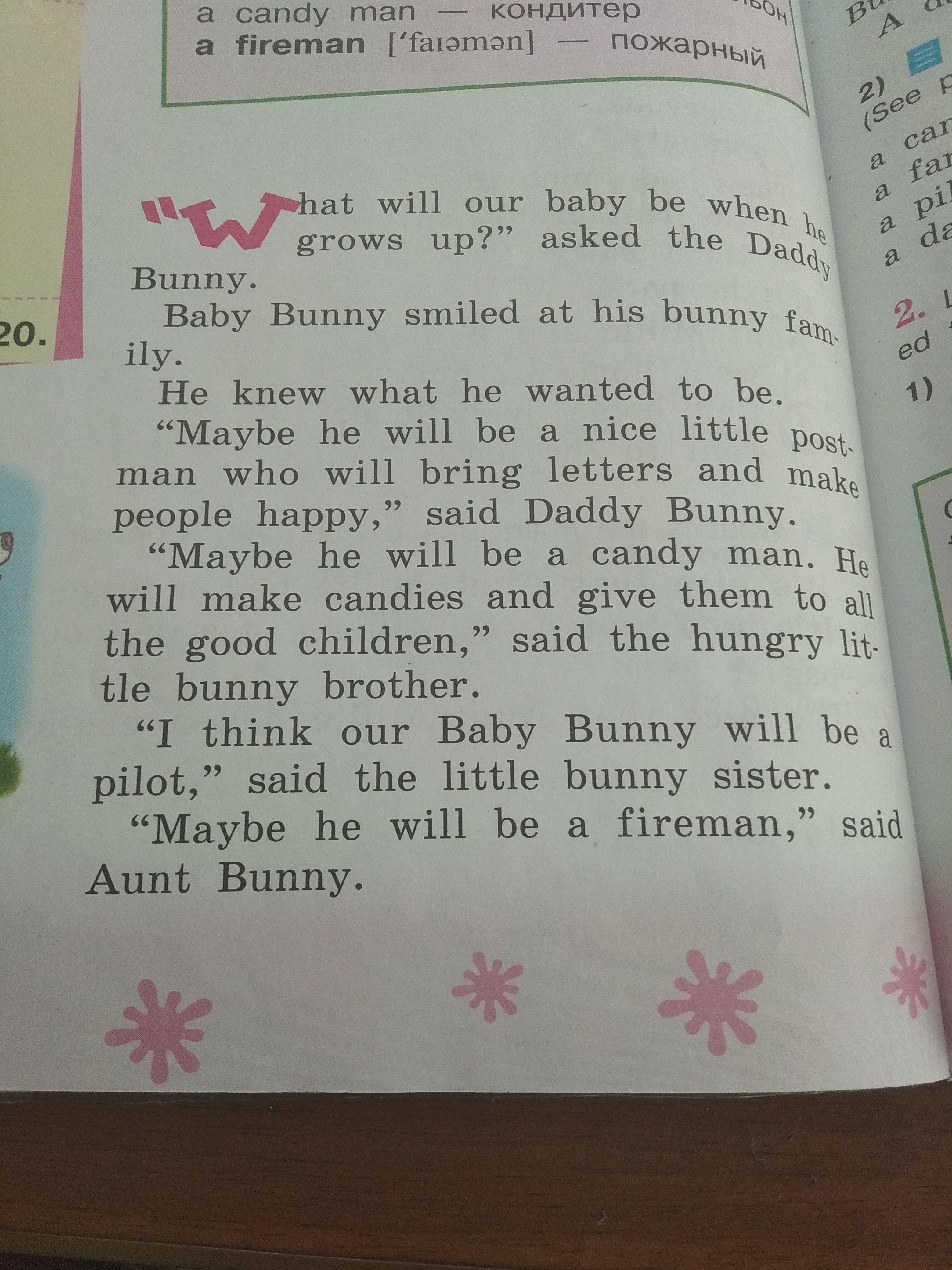 У него будет много маленьких крольчат, которых он будет кормить, когда они голодны. Он будет читать им сказки, когда они сонны и укладывать их в кроватку ночью. Вот кем будет малыш Кролик.