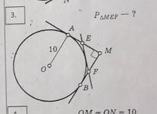 АЕ =ОЕ, FВ =FО, по свойству отрезков касательных, проведенных из точки вне окружности. Значит, периметр треугольника = сумме ЕМ+АЕ + FВ +FМ= 10+10=20