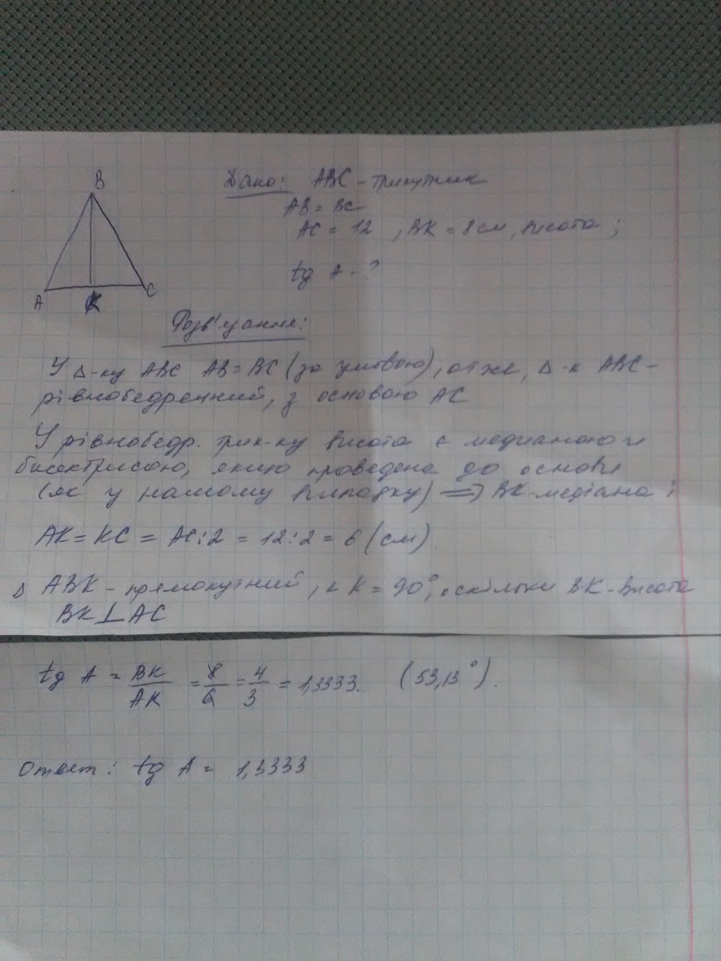 Дано: трикутник АВС; АВ=ВС, АС=12см, ВК=8см-висота. знайдіть: tgA-?