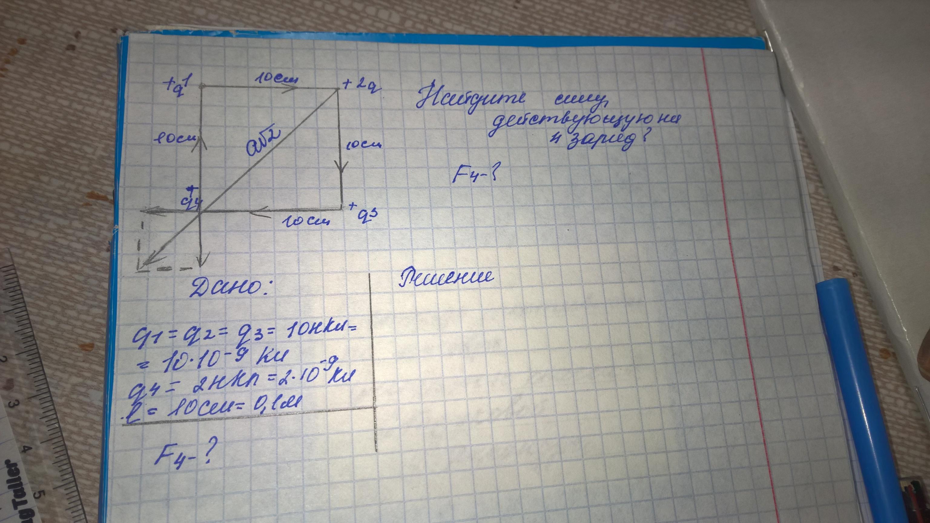 Кулона каждая сила: Fi=k*q4*qi/Ri², по модулю F1=F3=9*10^9* 2*10^-9* 10*10^-9/0.1²=180мкН, R2=0.1*√2, F2=90мкН, согласно принципу суперпозиции векторная сумма Fрез= F2+√2*F(1,3)= 90+1.41*180 =345мкН, направлена по диагонали параллелограмма (квадрата) сил F1 и F3