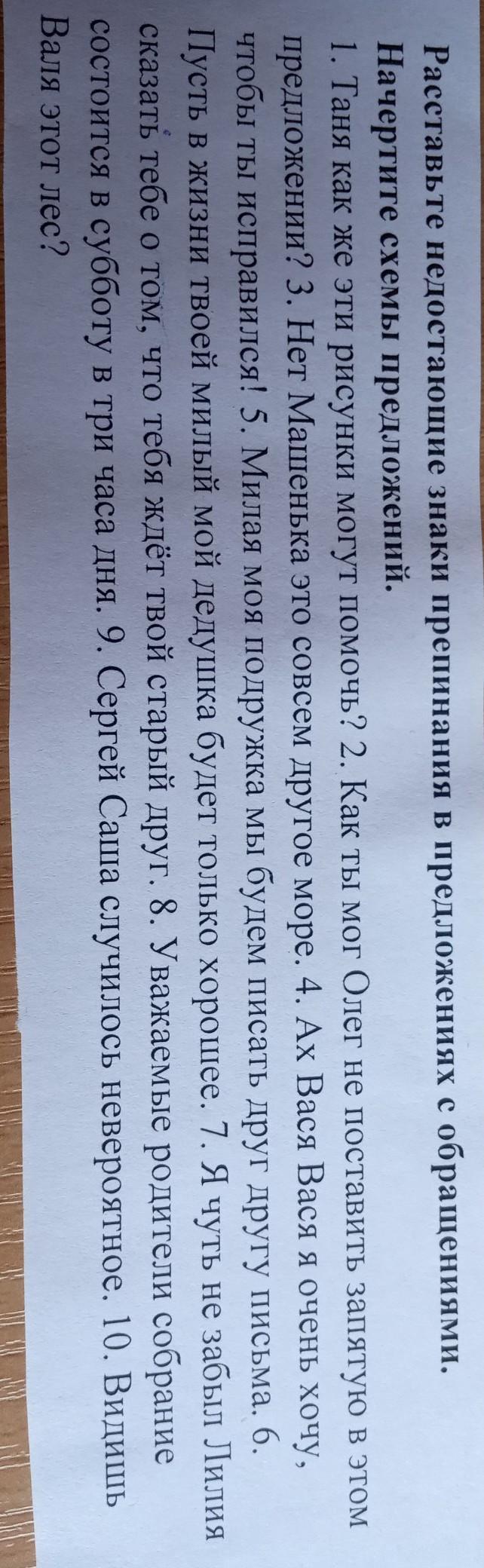 1)Таня, как эти рисунки, могут помочь?2) Как ты мог, Олег не поставить запятую в этом предложении?3) Нет Машенька это, совсем другое море.4) Ах, Вася, Вася я очень хочу чтобы ты исправился!5) Милая моя подружка, мы будем писать друг другу письма.6) Пусть в жизни твоей милый мой дедушка, будет только хорошее.7) Я чуть, не забыл Лилия, сказать тебе о том, что тебя ждет твой старый друг.8) Уважаемые родители, собрание состоится в субботу в три часа дня.9) Сергей, Саша случилось невироятное. Видишь Валя это лес.10)