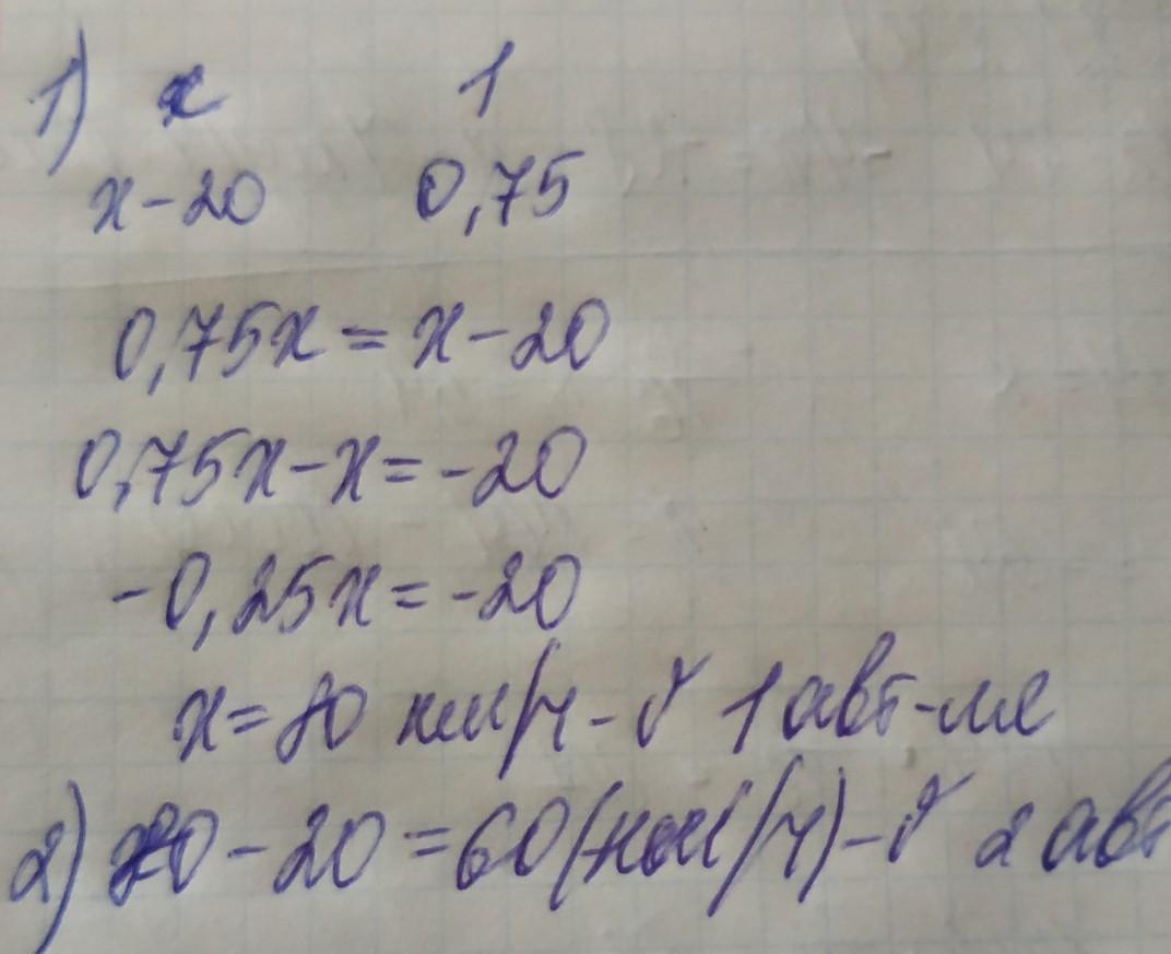 Из пункта А в пункт B одновременно выехали два автомобиля. Скорость первого автомобиля на 20км/ч больше скорости второго. Когда первый автомобиль прибыл в пункт B, второму автомобилю осталось проехать 1/4 расстояния от А до B. Найдите скорость второго автомобиля.