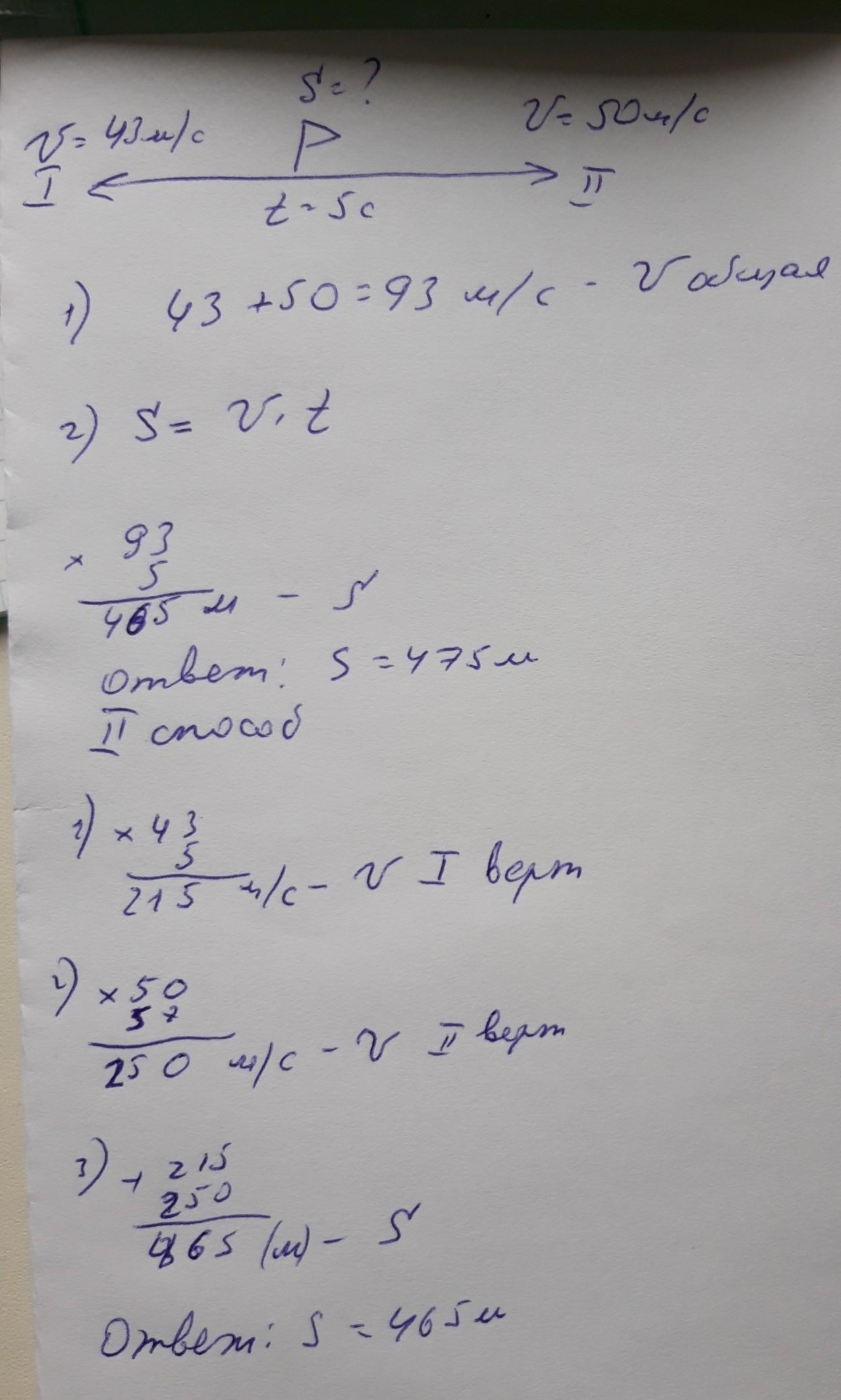Прочитай задачу дополнив схемы двух разных способов ее решения Запиши ответ. из одного аэропорта одновременно в противоположных направления для патрулирования вылетели два пожарных вертолёта. Скорость одного вертолета 43 м второго 50 м в секунду. Какое расстояние будет между ними через 5 секунд ?