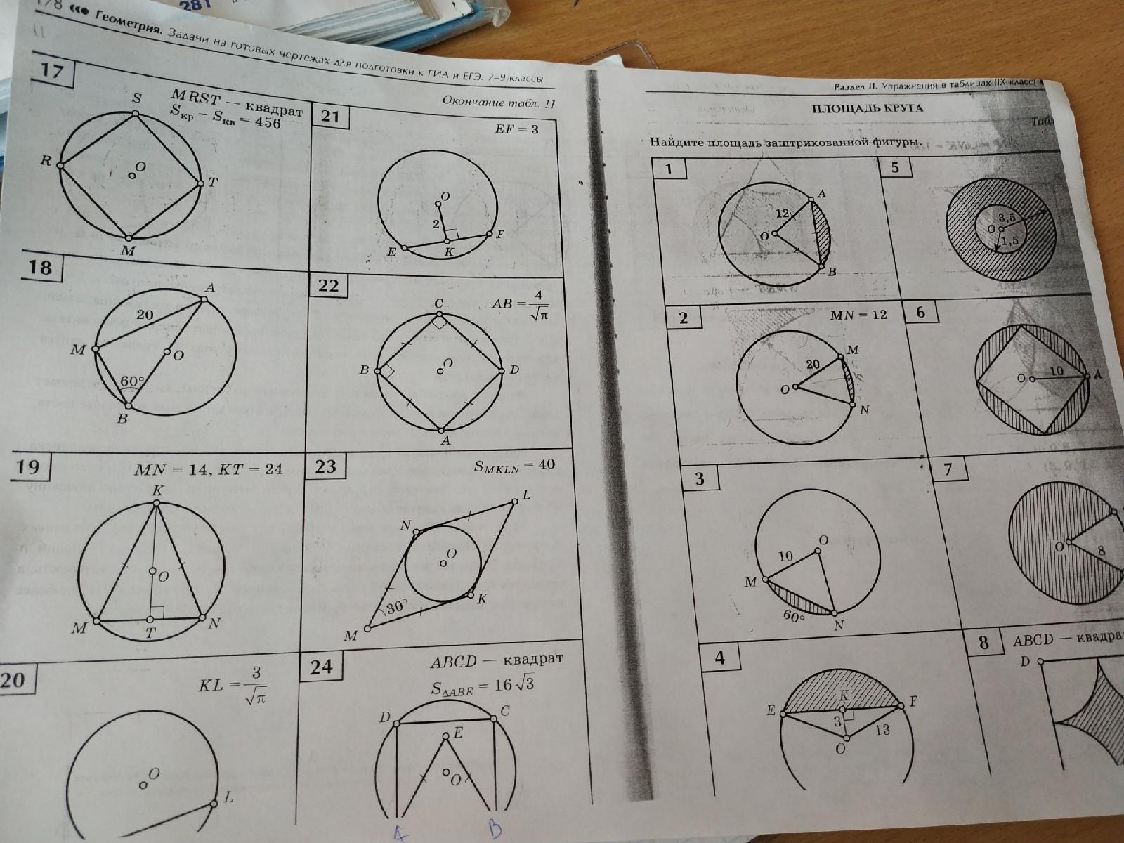 21. EK=KF=1/2EF=1.5 , соединяем точки O и E, получаем прямоугольный треуг. OEK. По теореме Пифагора: OE^2=EK^2+OK^2=4+2.25=6.25, следовательно OE=2.5 (это радиус круга). Площадь - πr^2=6.25π
