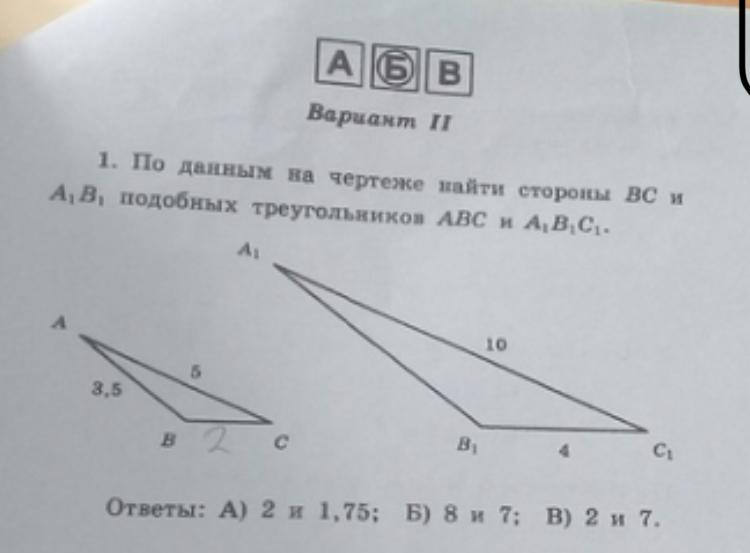 коэффициент подобия равен 2, то есть каждая из сторон треугольника abc меньше в 2 раза сторон треугольника a1b1c1. вс=2 (b1c1/2) a1b1=7(ab*2). Поэтому ответ под буквой В
