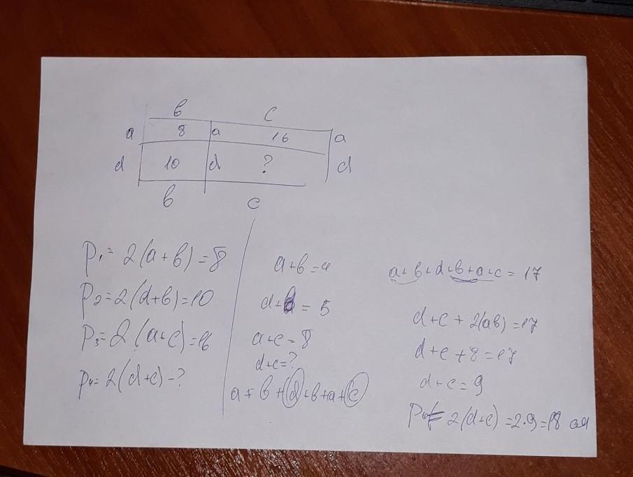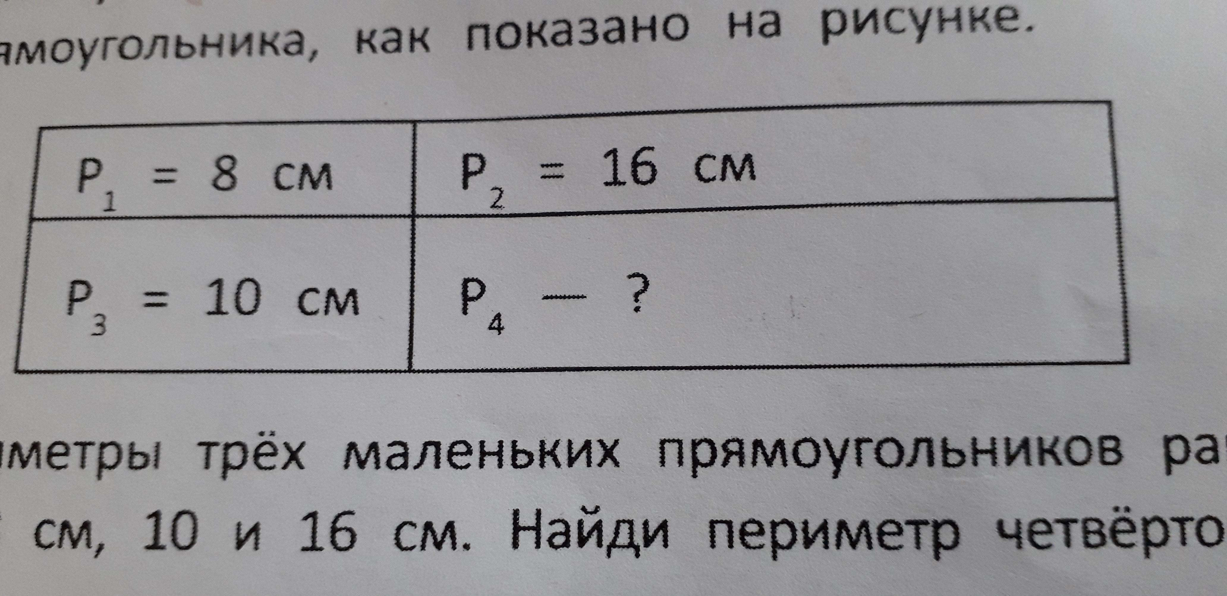 Прямоугольник разделили на 4 маленьких прямоугольника,ка показано на рисунке(рисунок ниже) СРОЧНО!!!! Найди периметр 4 маленького прямоугольника