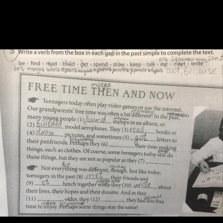 Write a verb from seven box in each gap in the past simple to complete the text.