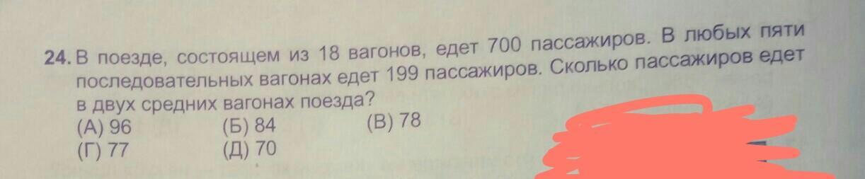 В поезде, состоящем из 18 вагонов, едет 700 пассажиров. В любих пяти последовательных вагонах едет 199 пассажиров. Сколько пассажиров едет в двух средних вагонах поезда ?