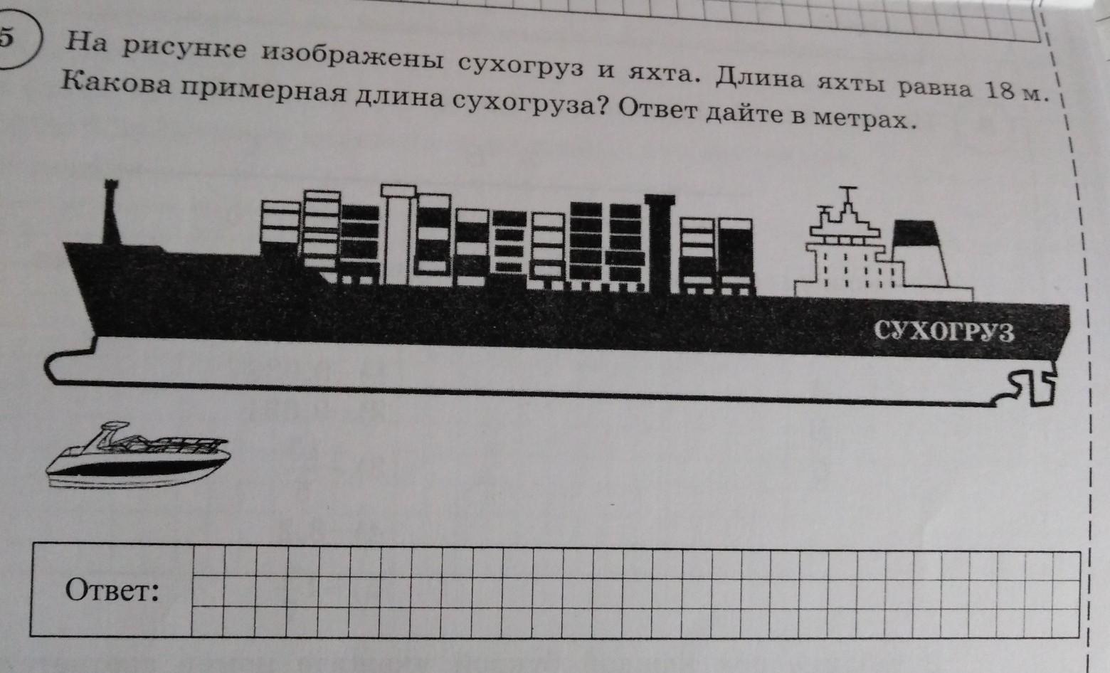 на рисунке видно, что сухогруз больше яхты примерно в 5 раз, следовательно 18*5=90(метров)