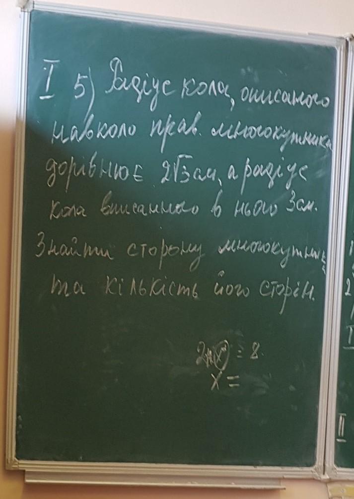 К сожалению, у меня нет на компьютере украинской раскладки. Но думаю, Вы поймете. Итак, радиус окружности r, вписанной в правильный многоугольник, связан с радиусом окружности R , вписанным в правильный многоугольник такой формулой r = R*Cos(180°/n), из этой формулы находим Cos(180°/n) =r/R=3/(2*√3)= √3/2, но это Cos30°, значит, 180°/n=30°, откуда n=6, т.е. дан правильный треугольник, а сторона правильного шестиугольника находится по формуле 2*R*sin(180°/6)=2*2√3*sin30°=2*2*√3*(1/2)=2√3/cм/
