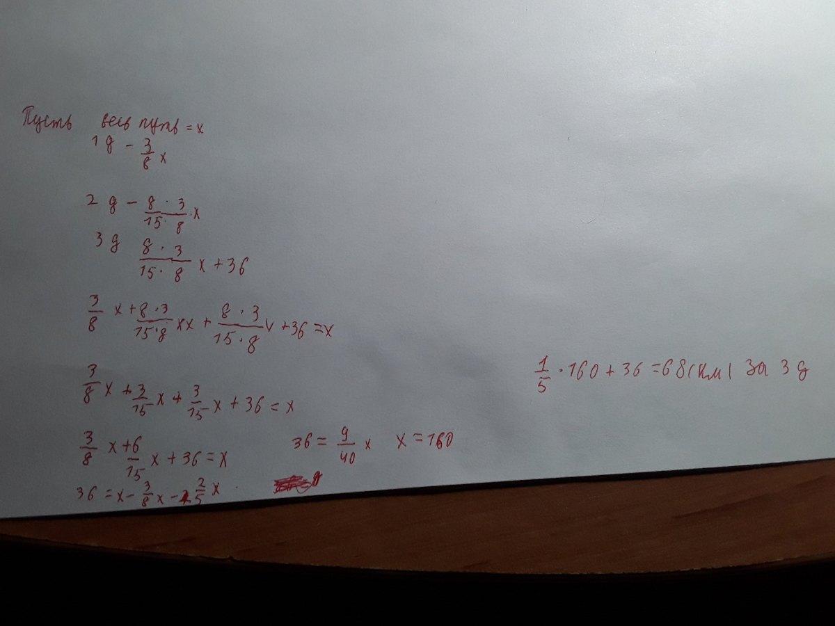 Машина прошла в первый день 3/8 всего пути, во второй - 8/15 того, что прошла в первый день, а в третий день - на 36 км больше, чем во второй. Сколько км прошла машина в третий день?