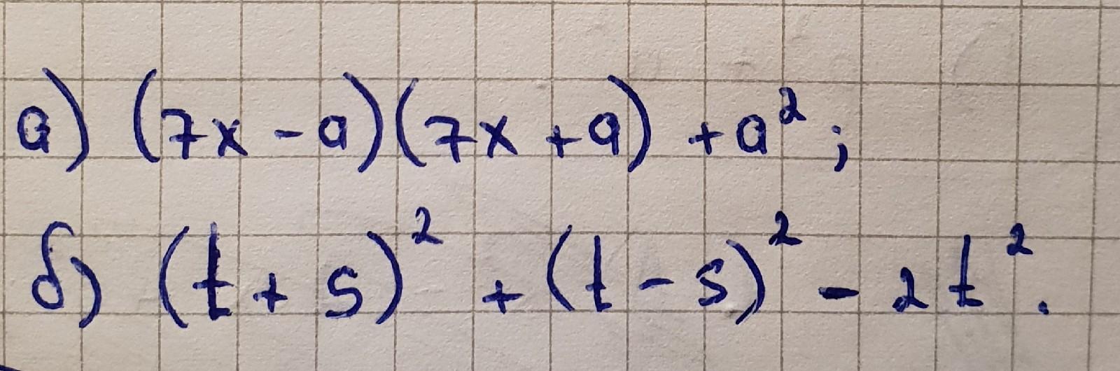 б) (t + s)² + (t - s)² - 2t² = t² + 2ts + s² + t² - 2ts + s² - 2t² =