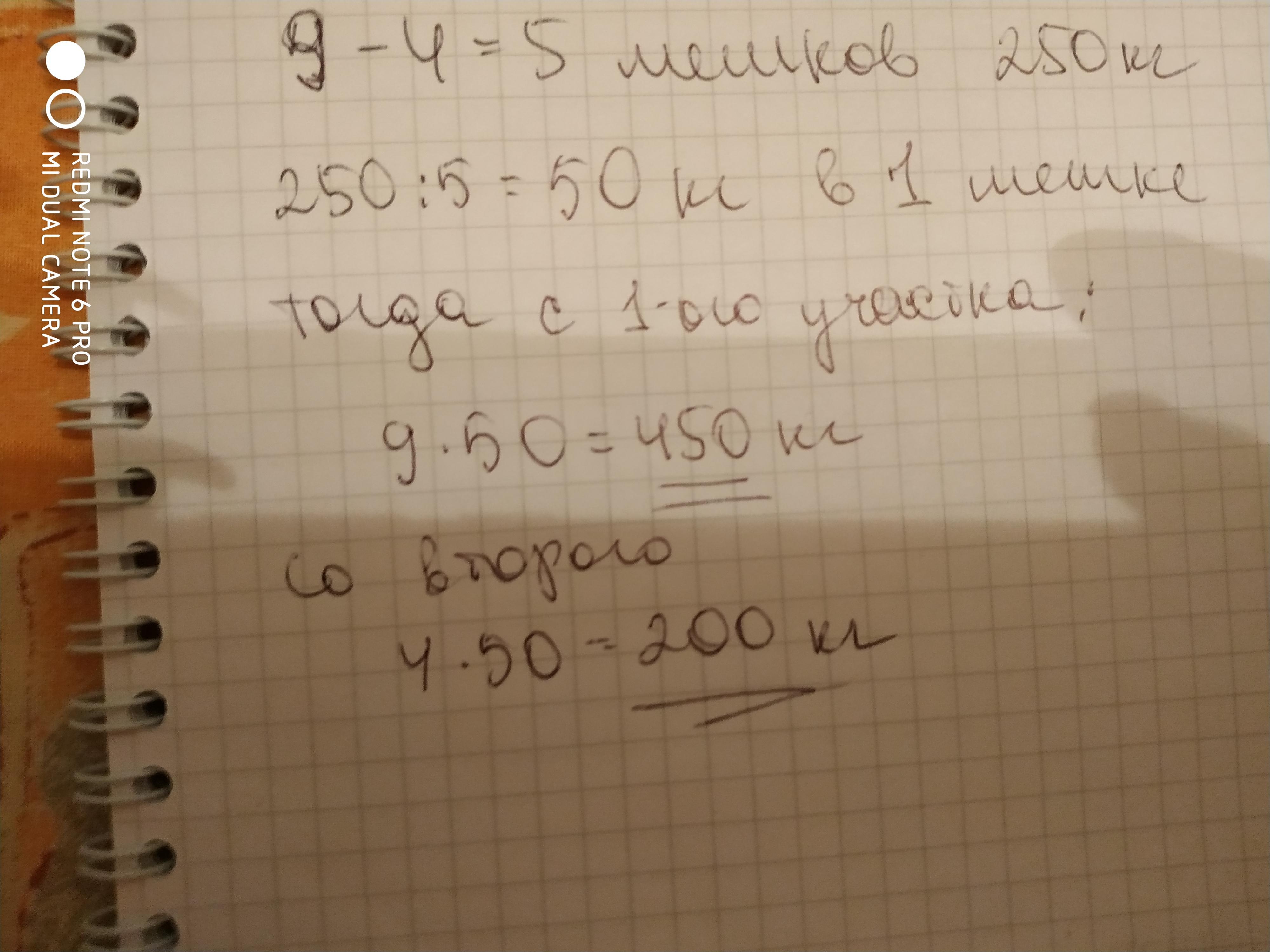 Реши задучу с краткой записью.С первого участка собрали 9 мешков картофеля,а со второго-4 таких же мешка,Со второго участка собрали 250 кг картофеля меньше,чем с первого.Сколько килограммов картофеля собрали с каждого участка отдельно?