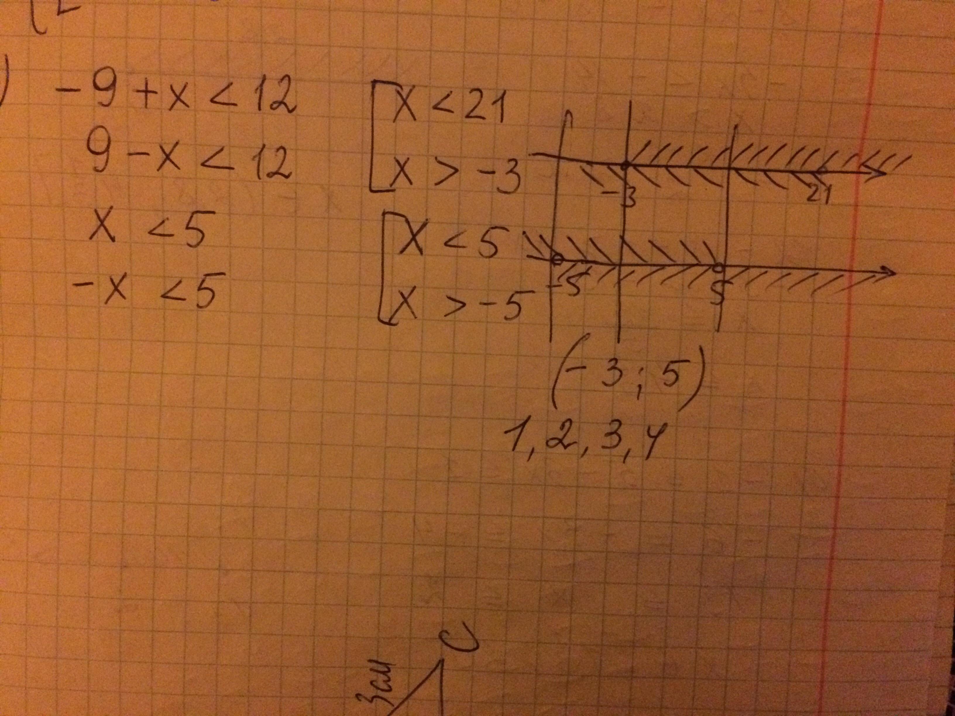 найдите такие натуральные числа, при которых одновременно верны неравенства |9-х|<12 и |х|<5