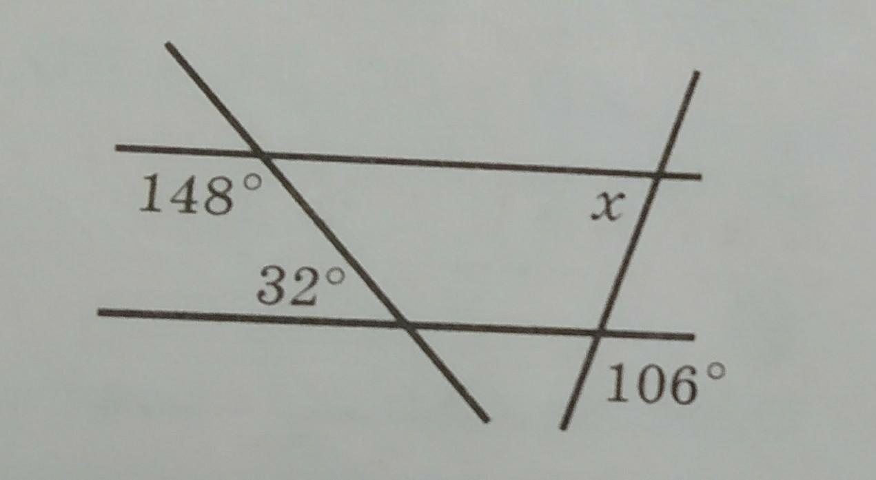 у угла 106 есть вертикальный угол и он булет равен 106, а этот угол будет равен x так как одностороние углы при двух паралельных будут равны, значит x будет равен 106 градусам