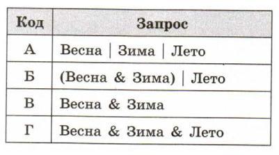 В таблице приведены запросы к поисковому серверу. Для обозначения логической операции «ИЛИ» в запросе используется символ «|», а для логической операции «И» — «&». Для каждого запроса указан его код — соответствующая буква от А до Г. По всем запросам было найдено разное количество страниц.