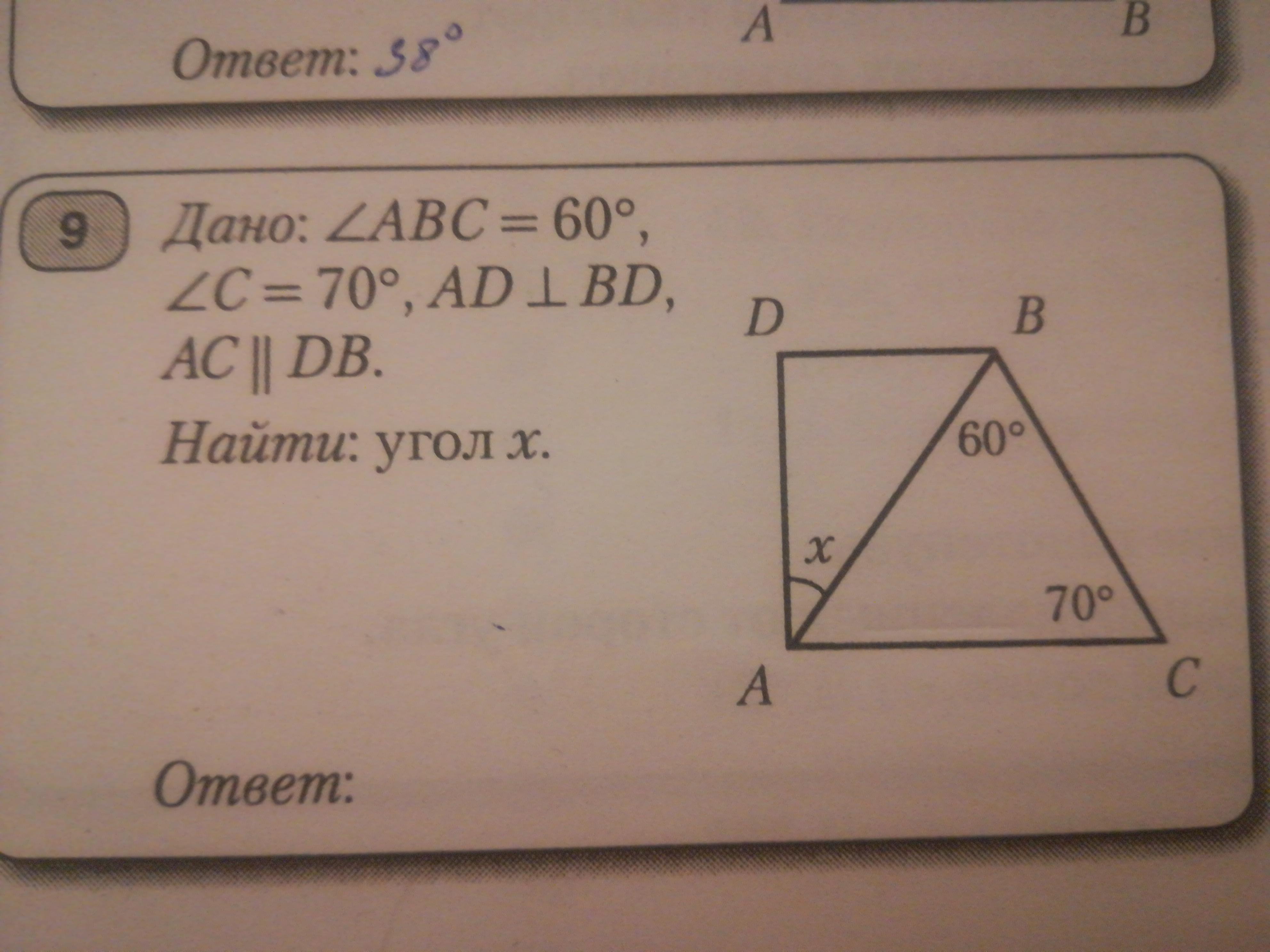 Угол ABC = 60 градусов; угол C = 70 градусов; AD принадлежит BD; AC поролельна DB