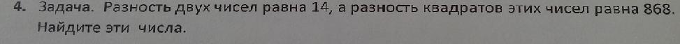 задача- разность двух чисел равна 14, а разность их квадратов равна 868. найдите эти числа