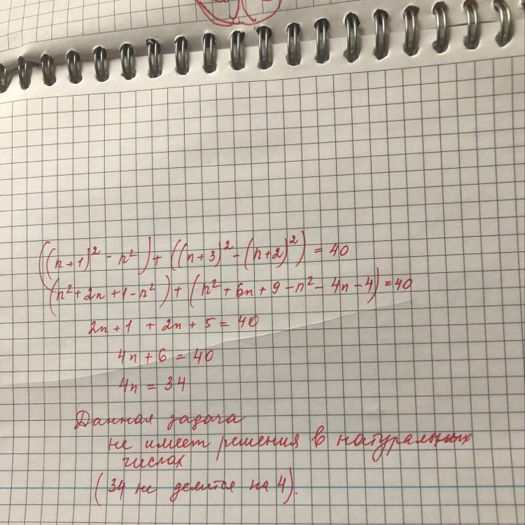 сумма разности квадратов двух последовательных натуральных чисел и разности квадратов следующих двух последовательных натуральных чисел равна 40. Найдите эти числа, если разности квадратов неотрицательны