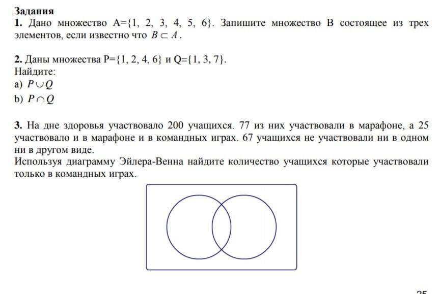 3) 1 вар. В условии сказано, что в марафоне участвовало 77 чел. Но эти же люди могли участвовать и в командных играх (КИ). В марафоне и в ком. играх вместе (М+КИ) участвовало 200-67=133 чел. Только в командных играх (КИ) участвовало 133-77= 56 человек. Только в марафоне участвовало 77-25=52 человека. Смотри рисунок 1.